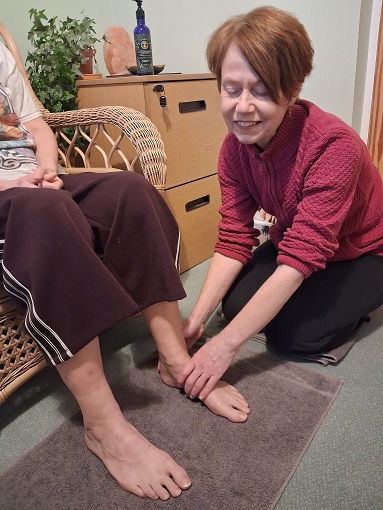 If you are a wheelchair user or find reclining on a couch uncomfortable, you can still receive a Reflexology treatment. I am trained in Vertical Reflex Therapy (VRT), also know as Vertical Reflexology. This means that I work the top of the feet to access reflexes. When a client is in a weight-bearing (standing) or semi-weight bearing (seated) position the body's response to reflexology is accelerated as a more direct and intense link to the reflexes and the body parts that they represent is created. VRT can also be useful if you don't have mobility issues. Just 5 minutes of VRT before a classical treatment (where the client is reclining on a couch) seems to prime the body, making it more receptive to reflexology. If your feet are painful or inaccessible, I also offer hand reflexology.